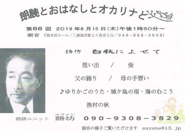 夏の会 朗読とおはなしとオカリナと ご案内 カテゴリ:語坊より 2019年08月04日 皆様いかがお過ごしでしょうか。 いよいよ語坊今年の「 夏の会 」となります 第66回目の定期朗読会が迫ってきました。 8月15日(木) 「 潮音 」で開催です。 お出かけお待ちしています。 テーマは ~白秋によせて~ といたしました。 語坊版に仕立てての朗読となりますが、 お聞きいただきたくご案内いたします。 この日はこの会場のあります地の三浦市内、 かの三崎城ヶ島方面で花火大会があると広報されています。 20時から20分間だそうです。 雨天順延。 混み具合が恐ろしい感がありますが、 ご一興までにお知らせ。